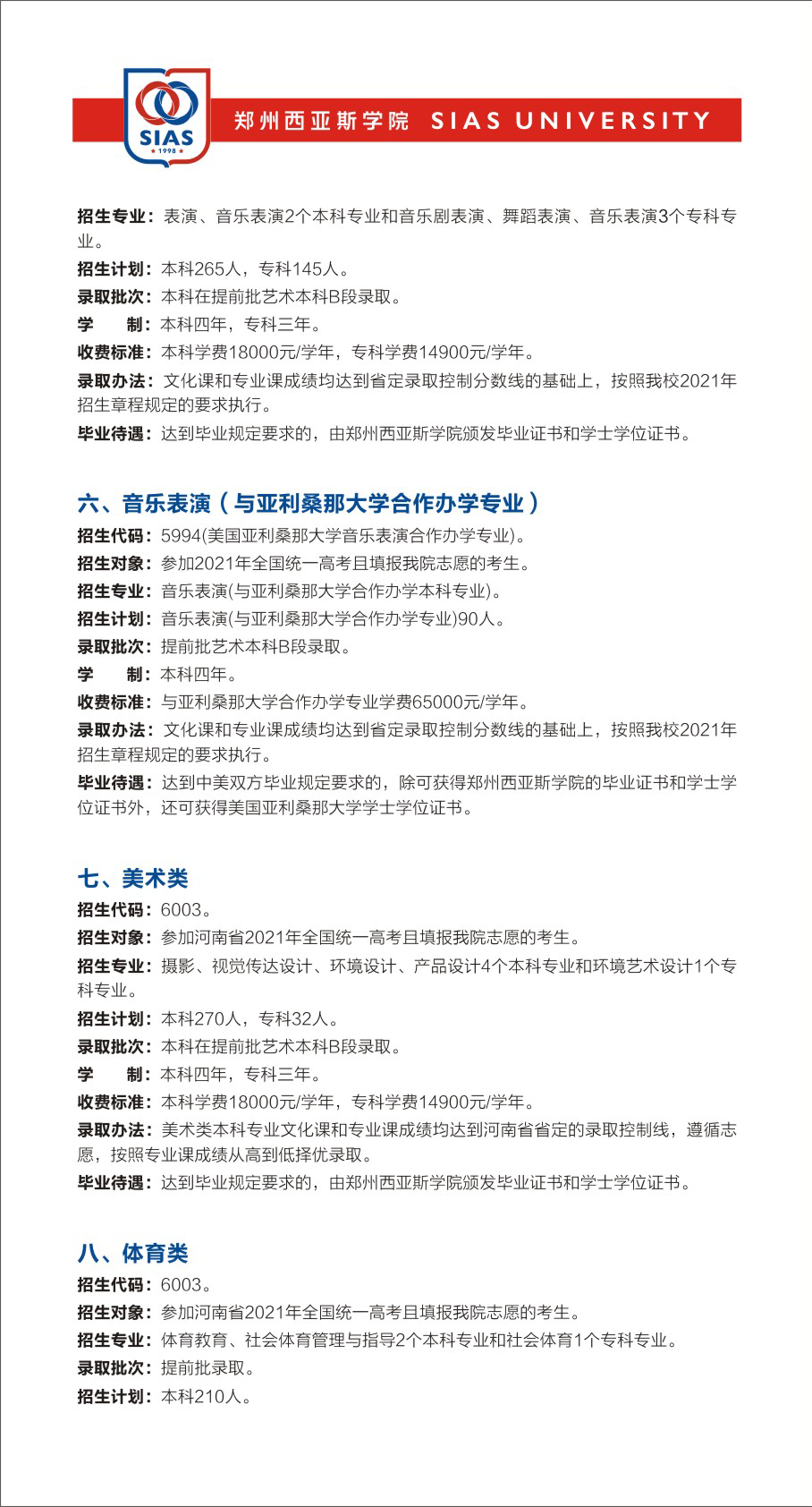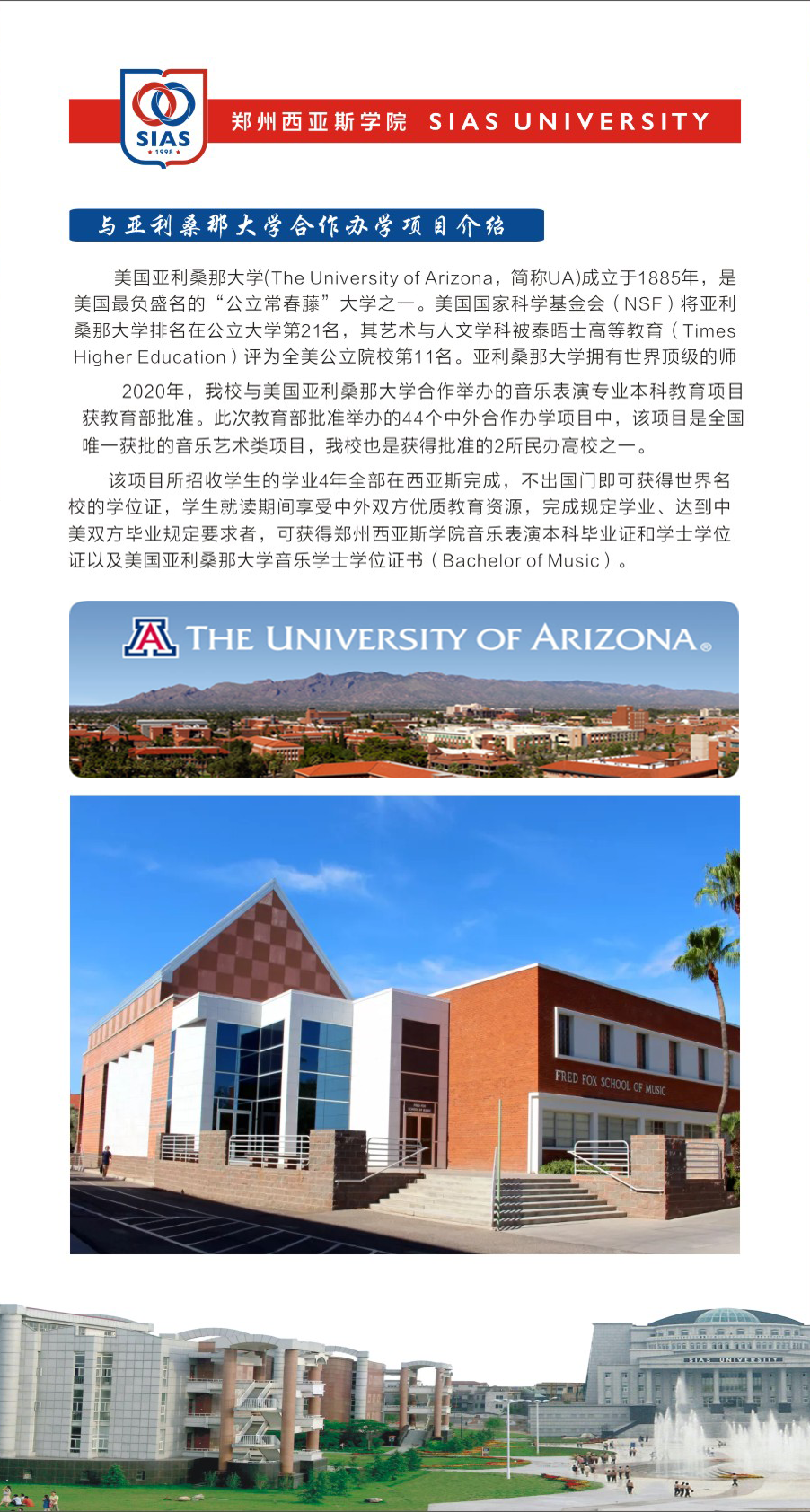 与美国亚利桑那大学合作办学项目学生达到中美双方毕业规定要求的,除可获得郑州西亚斯学院颁发的毕业证书和学士学位证书外,还可获得美国亚利桑那大学音乐学士学位。