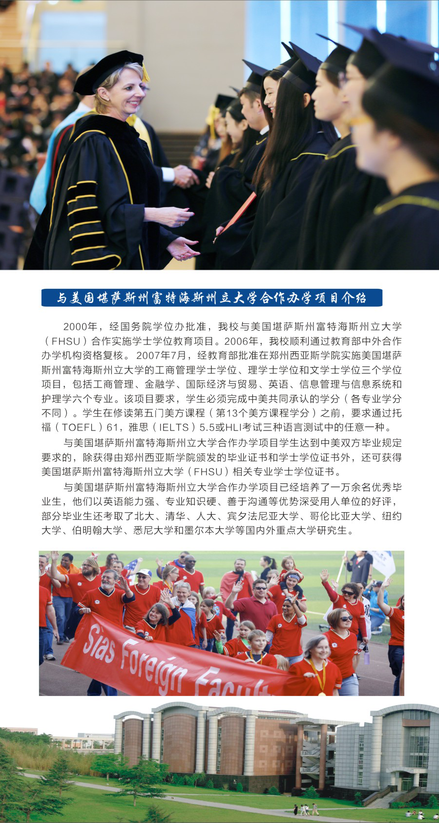 与美国堪萨斯州富特海斯州立大学合作办学项目学生达到中美双方毕业规定要求的,除可获得郑州西亚斯学院颁发的毕业证书和学士学位证书外,还可获得美国堪萨斯州富特海斯州立大学相关专业学士学位证书。